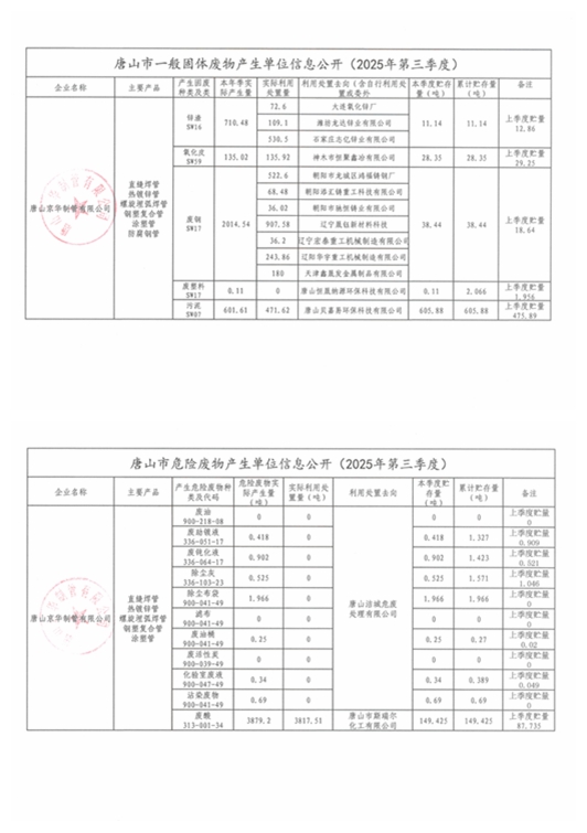 唐山京華制管有限公司2025年第三季度信息公開