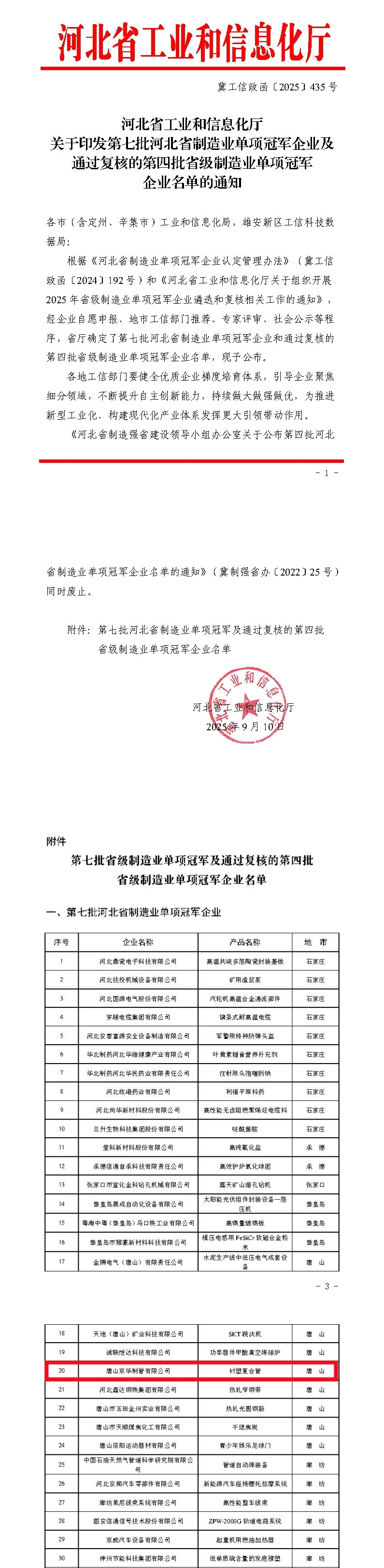 近日,河北省工業(yè)和信息化廳公布了2025年度河北省制造業(yè)單項冠軍企業(yè)名單,公司生產(chǎn)的襯塑復合管產(chǎn)品成功入選,獲得“河北省制造業(yè)單項冠軍企業(yè)”認定。